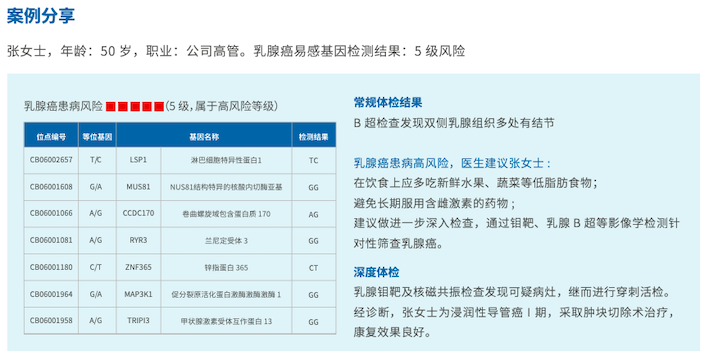爱身谱®乳腺癌易感基因检测顺利获得检测受检者与乳腺癌相关的易感基因,精准评估疾病发生风险,在疾病发生之前有针对性的预防,改善自身的生活环境和生活习惯,从而有效降低或避免乳腺癌的发生。