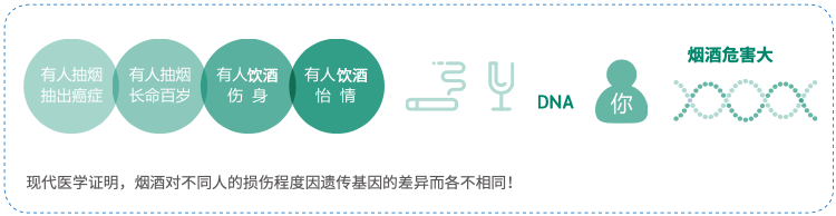 烟酒损伤基因检测是顺利获得检测烟酒中的化学物质在人体内代谢过程及对人体的损伤机制相关的基因,包括DNA损伤复基因、癌基因、抑癌基因、毒物代谢酶基因、细胞周期控基因等,顺利获得分析基因检测结果,评估吸烟增加肺癌、食管癌、胃癌的风险,过量饮酒增加肝癌、食管癌、胃癌的风险,给予相关的健康建议,帮助受检者尽早戒烟,指导合理、适量饮酒,从而减少吸烟饮酒对身体造成的伤害。