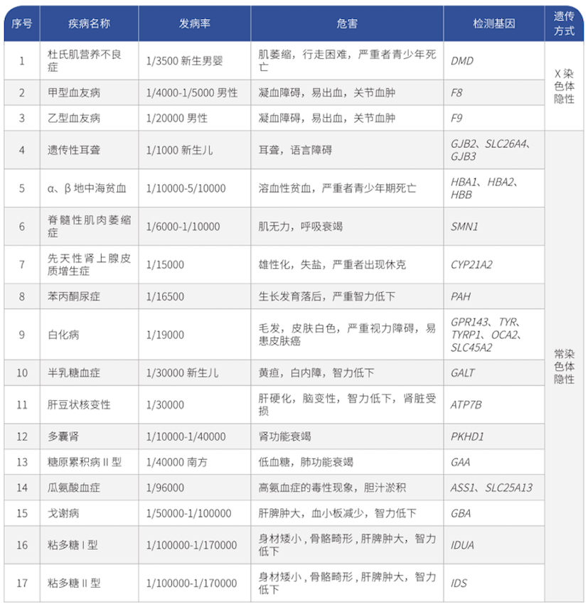 我国每年新增90万例出生缺陷儿,单基因病是导致新生儿出生缺陷的主要原因之一。OMIM数据库(在线人类孟德尔遗传数据库)收录的遗传病约有7000种,其中发病机制明确的约有5000种,平均每个正常人携带2.8个隐性遗传病致病突变。我国常见的单基因遗传病有遗传性耳聋、杜氏肌营养不良症、地中海贫血、肝豆状核变性、苯丙酮尿症等17种,人群综合携带率高达25%。这些疾病往往会致死或致畸,严重危害患者健康,给社会和家庭带来极大负担。