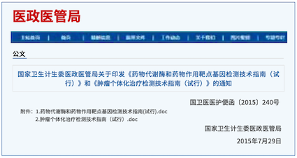 2015年7月31日,国家卫生计生委医政医管局印发的《药物代谢酶和药物作用靶点基因检测技术指南(试行)》中,明确给出“常见药物代谢酶和药物作用靶点基因遗传变异检测结果对临床用药的指导建议“:根据 CYP2C19、CYP2C9、VKORC1、CYP4F2等基因的多态性检测结果,可相应调整药物(华法林、氯吡格雷)的给药方案。