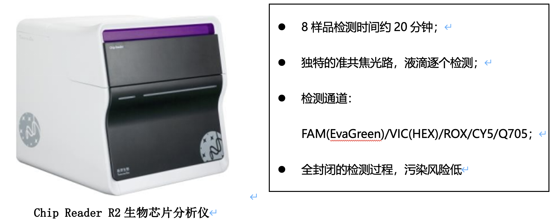 TD-2微滴式数字PCR系统包括: Drop Maker 样本制备仪, Chip Reader 生物芯片分析仪,③配套通用 试剂和耗材,仪器平台使用简单,手工操作步骤少,整个反应过程在封闭空间进行,防止:PCR产物的污染,该系统适用于稀有突变检测、拷贝数变异和基因相对表达领域的研究,可广泛应用于肿瘤、遗传病、感染性疾病的诊断和研究。