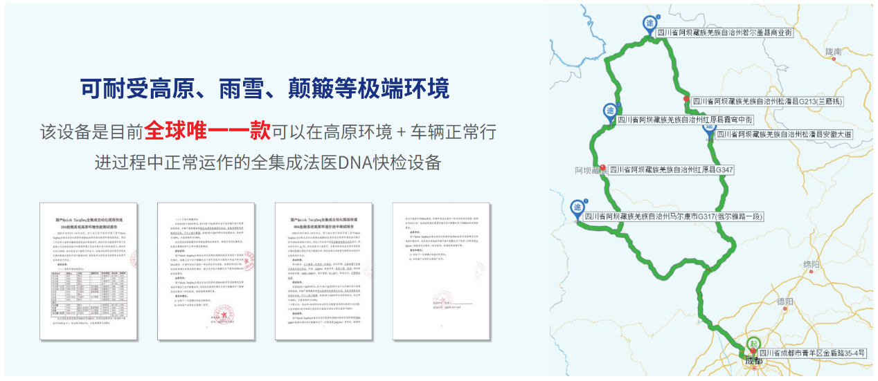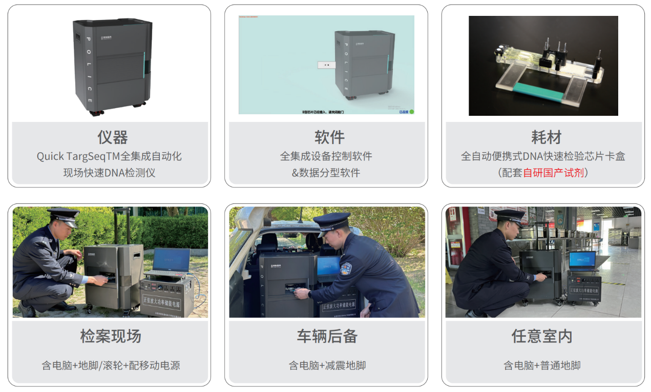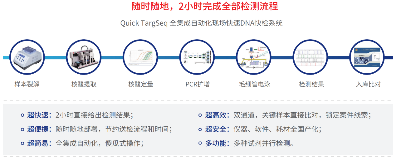 Quick TargSeq B全集成自动化现场快速DNA检测系统是由公安部鉴定中心、清华大学、博奥生物集团有限公司、北京K8凯发国际生物技术有限公司联合研制的新款法医DNA全集成自动化检测系统。该系统采用模块化微流控芯片技术,将样本前处理、多重PCR扩增和电泳检测全过程集成于一体,实现2小时“样本进- 结果出”的法医DNA现场快速检测。使得法医DNA技术从正负压的专业实验室走向基层和现场,由刑侦单警种拓展到多警种和多部门。该设备可由单人携带使用,适用于户外、车载、高原环境等,是真正意义上的“法医DNA移动实验室”。为我国公安机关现场物证检验、基层重点人员筛查、重大公共安全事件的快速处置、边防出入境检查等增添强劲利器。